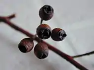 Сверху вниз. Ветка со взрослыми листьями и бутонами. Соцветие. Плоды |