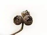 Плоды на ножках, от шаровидных до кубарчатых, длиной 7—10 мм, диаметром 10—12 мм, с выпуклым диском и заметно выдвинутыми створками.