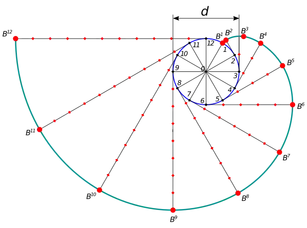 Имеется окружность диаметра с центром в точке . Данную окружность делим на двенадцать равных частей. В точках 2, 3, 4, … проводим касательные к окружности, направленные в одну сторону. Точки эвольвенты находим исходя из того, что при развёртывании окружности точка должна отстоять от точки 2 на расстоянии, равном длине дуги между точками 1 и 2, а точка должна отстоять от точки 3 на расстоянии, равном длине дуги между точками 1 и 3 (две длины предыдущей дуги), и т. д.