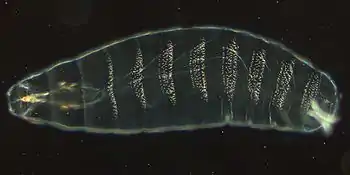 Данную задачу до конца смогли решить и объяснить через исследование дрозофилы Drosophila melanogaster , она является одним из модельных организмов. Пошаговый контроль эмбриогенеза эксперименте с дрозофилой ( Эмбриогенез дрозофиллы ) визуализировали с помощью присоединения флуоресцентных красителей к каждому типу белка, который отвечал за тот или иной участок развития дрозофилы.[10]
