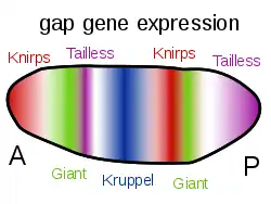 Bicoid стимулирует развитие переднего отдела эмбриона дрозофилы двумя путями. С одной стороны, он связывается с мРНК caudal, ингибируя её трансляцию и таким образом подавляя программу развития заднего отдела, которую активирует caudal. С другой стороны, он является транскрипционным фактором семейства Hox[27] и связывается с регуляторными участками гена hunchback, активируя его.[28] Для активации этого гена не нужны большие концентрации Bicoid, что также подтверждалось в экспериментах с нокаутом swallow и exuperantia: в таких мутантах нормально образовывались структуры торакса, но не головы. Было предсказано, что эти гены имеют энхансеры с меньшей аффинностью, что потом блестяще подтвердилось в эксперименте для генов buttonhead, empty spiracles и orthodenticle. Энхансеры этих генов также имеют сайт связывания Hunchback.[29] Под регуляцией Bicoid также находится ген knirps, который экспрессируется из всей передней части зародыша только в акроне, поскольку одновременно его репрессирует hunchback. На этом примере видно, что именно разные пространственно-временные комбинации имеют решающее значение для тонких эффектов смены программы для отдельных клеток. Аналогично, ген evenskipped активируется Bicoid только во втором брюшном сегменте, так как там наблюдается требуемая низкая концентрация Bicoid, а также присутствует Hunchback.[30]