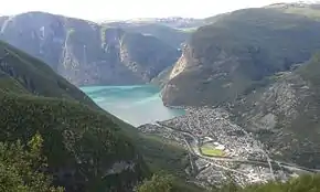![]() Вид на Эвре-Ордал и северо-восточную оконечность озера Ордалсватнет с обзорной точки «1000 метров» (сентябрь 2015 года) | |||