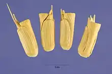 Колосковые чешуи 7—10 мм длиной, не вздувшиеся, острошероховатые, с одним зубцом на верхушке и одной остью, более менее длиной. Нижняя цветковая чешуйка длиной около 10 мм, у боковых колосков с одним зубцом, у верхушечных — с двумя зубчиками, промеж которых одна ость[2].