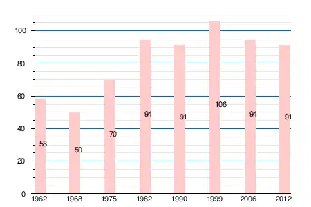 | 1962 | 1968 | 1975 | 1982 | 1990 | 1999 | 2006 | 2008 | 2011 | 2012 |