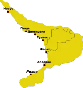 В эпоху могущества значительными городскими центрами были: столица Эгриси — Археополис (современный Нокалакеви), Родополис (современный Варцихе), Вашнари, Петра (современный Цихисдзири), Апсар (современный Гонио) и другие[2].