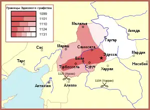 В 1116 — 1117 годах за счет захвата владений армянских князей территория графства значительно увеличивается. У Васила Тга был отнят Рабан, Кесун, Ромкла, Бехесни и возможно Хисн Мансур. Из Пира был изгнан князь Абелгариб Пахлавуни, владения которого были аннексированы. Изгнанию подвергся и некогда сподвижник и проводник крестоносцев в Малой Азии, князь Гуриса Баграт Камсаракан[6]