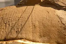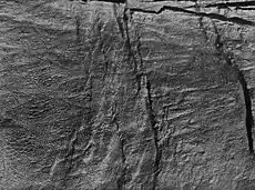 - «Тротуарная плитка» (англ. pavement) — плоские и многоугольные чешуи большего размера, но обычно не более 5 мм в диаметре, только на предплечье достигавшие 10 мм в диаметре. Чешуи второго типа располагались группами, которые разделялись участками кожи с чешуёй первого типа, причём на стыках встречаются чешуи переходной формы. На большей части тела чешуйки были сгруппированы в круглые или овальные участки, но на плече чешуйки группировались рядами, параллельными лопатке. Вообще, группы чешуек были большими на верхней части тела (над бёдрами достигая в длину 50 см) и мелкими на нижней стороне[40].