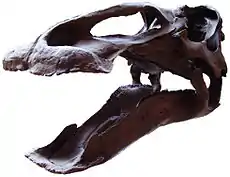 Длина черепа взрослого эдмонтозавра могла превышать метр. Один из известных черепов E. annectens (ранее классифицировавшегося как анатотитан) достигает в длину 1,18 м при общей длине скелета 11,5 м[15]. В профиль череп эдмонтозавра имел приблизительно треугольную форму[16], костяной гребень отсутствовал[17]. Если смотреть на череп сверху, то можно заметить, что его «клюв» был широким, как у утки или колпицы. Клюв был покрыт слоем кератина и не имел зубов — последняя черта характерна для всех гадрозавридов, кроме примитивного тельматозавра[18]. Значительная часть такого кератинового покрытия сохранилась на верхней части клюва «мумии» из коллекции Зенкенбергского музея естественной истории. У этого экземпляра сохранившаяся кератиновая часть клюва выдаётся вперёд по отношению к кости не менее чем на 8 см и направлена отвесно вниз по отношению к ней[19]. У экземпляра из Лос-Анджелесского окружного музея клюв с верхней челюсти выдаётся вперёд на 11 см и опускается на 5 см ниже предзубной кости нижней челюсти, перекрывая её переднюю поверхность[20].