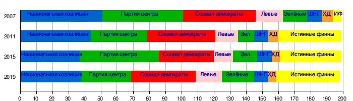 Парламент, избранный в 2007 году, сформировал правительство из партий правого крыла. Крупнейшими партиями, прошедшими в парламент, стали Национальная коалиция и Партия Финляндский центр. Социал-демократическая партия Финляндии, которая долгое время находилась у власти, оказались в оппозиции. Другими партиями, прошедшими в парламент, стали Левый союз, Шведская народная партия (в том числе представитель Аландской коалиции, Зелёный союз и Партия истинных финнов.