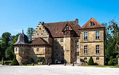 Замок состоит из центрального здания, к каждому концу которого под прямым углом пристроено боковое крыло. Центральное и южные здания по-прежнему сохраняют стены и многие элементы XVI века, а северный флигель («гостевой дом») существенно отличается: он построен в 1735 году в стиле рококо.