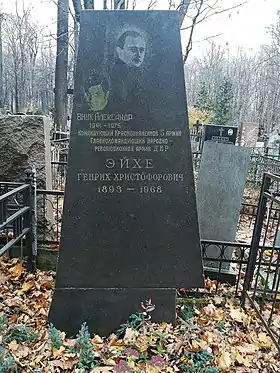 В 1919 году жили они с матерью в подвальной комнатушке на 3-й Сокольнической улице в Москве. Жили, как все в то время, материально неважно. Я в то время командовал уже 26 стрелковой дивизией. Писал редко (да и почта работала неважно). Приехав в Москву в отпуск в августе 1919, я не застал его в живых — он умер в июле 1919 в больнице от неудачной операции горла. … Мать рассказывала мне, что в свободные от дежурства дни он ходил туда, где были размещены военные лазареты, и расспрашивал у прибывающих с фронта раненых, не знают ли они на фронте командира Эйхе. И велика была, по словам матери, его радость, когда находился кто-нибудь, кто мог хотя бы понаслышке что-либо рассказать обо мне. Старик тогда ходил радостно возбужденный, поговаривая: „Жив Генрих, значит приедет, да еще мне рассказывал солдат его, что воюет неплохо“. Радовался старик и надеялся, может быть, что и ему после тяжелой полувековой трудовой честной жизни удастся отдохнуть, что сын отблагодарит, за то, что он ему дал, а дал он столько, сколько смог.