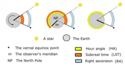 Прямое восхождение равно длине дуги экватора от точки весеннего равноденствия до круга склонения светила и отсчитывается против направления вращения небесной сферы. С прямым восхождением также связано так называемое звёздное дополнение , используемое в навигации: оно также равно длине дуги от точки весеннего равноденствия до круга склонения светила, но отсчитывается в направлении вращения небесной сферы. Таким образом, [1].