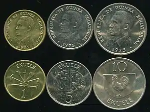 В 1975 году были выпущены монеты в 1, 5 и 10 экуэле (ekuele). В 1978—1983 годах чеканились памятные монеты из драгоценных металлов в 1000, 2000, 5000, 10 000 экуэле[8].