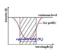 здесь представляет интенсивность континуума по обе стороны от функции поглощения (или излучения); представляет интенсивность по всему интересующему нас диапазону длин волн. Тогда представляет ширину гипотетической линии, которая падает до нулевой интенсивности и имеет «тот же интегрированный дефицит потока из континуума, что и истинный»[2]. Это уравнение может быть применено как к излучению, так и к поглощению, но применительно к излучению значение является отрицательным, и поэтому используется абсолютное значение.