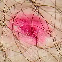 Сикозиформная экзема. Может наблюдаться у лиц, страдающих сикозом, осложнённым экзематизацией. У этих больных возникают фолликулярные пустулы, пронизанные в центре волосом, рецидивирующие и находящиеся на воспалённой коже, — симптомы сикоза. Сикозиформная экзема характеризуется выходом процесса за пределы оволосения, наличием экзематозных колодцев, мокнутием и сильным зудом. Кожа становится лихенифицированной; фолликулы появляются беспрерывно. Излюбленная локализация процесса — верхняя губа, борода, подмышки, лобок.