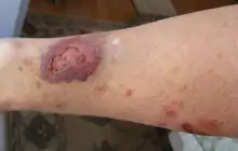 Варикозная экзема. Возникновению болезни способствует варикозный симптомокомплекс в области нижних конечностей. Она локализуется в области расширенных вен, на окружности варикозных язв, участков склерозирования кожи. Факторами, благоприятствующими развитию болезни, являются травмы, повышенная чувствительность к медикаментам, применяемым для лечения варикозных язв, мацерация кожи при наложении повязок. Характерны полиморфизм элементов, резкие, чёткие границы очагов, умеренный зуд, что делает варикозную экзему в клиническом аспекте сходной с микробной и паратравматической.