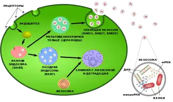 Экзосомы — микроскопические внеклеточные везикулы (пузырьки) диаметром 30—100 нанометров, выделяемые в межклеточное пространство клетками различных тканей и органов[1][2][3]. Полость экзосом имеет цитоплазматическое происхождение[4] и содержит белки, РНК и липиды[5][6], мембрана экзосом образуется в результате впячивания внутрь эндосомальной мембраны[7][8].
