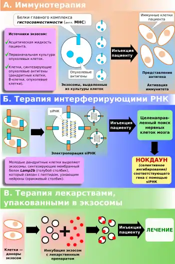 Методами биоинженерии была получена культура дендритных клеток, производящих экзосомы, несущие мембранный белок Lamp2b, связанный с пептидом, узнающим нейроны. В выделенные из этой культуры экзосомы при помощи электропорации «загружали» малые интерферирующие РНК. Внутривенная инъекция таких экзосом, ориентированных на поиск нейронов, приводила к нокдауну гена, на который эти РНК были нацелены[15][102][103][104][105][106].