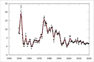 Инфляция, как правило, составляет 2—3 %, а основная процентная ставка 1,5—5 %. Сектор услуг в экономике, включая туризм, образование и финансовое обслуживание, составляет 70 % от ВВП[23]. Австралийский национальный университет в Канберре поддерживает проект прогнозирования процентной ставки для Австралийской экономики, которая вычисляется по статистическим данным так называемыми «теневыми» членами преподавательского состава АНУ.[24]