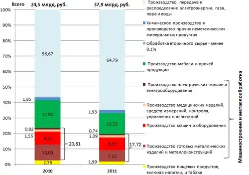 Ключевые позиции в структуре обрабатывающей промышленности остаются у машиностроения. Доля организаций, производящих машины и оборудование в 2009 году составила 17,2 %, в 2005 году — 24,5 %. Объемы произведенной продукции в этом виде экономической деятельности по итогам 2009 года выше уровня 2005 года на 42,7 %.Еще 9 % занимало производство готовых металлических изделий(5,2 % — в 2005 году).