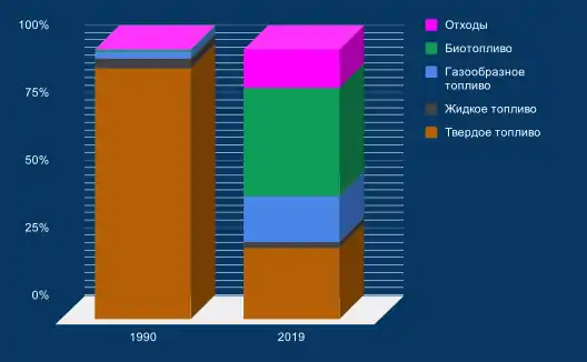 В структуре производства первичной энергии свыше 41% приходится на сырую нефть и нефтепродукты и 22% на природный газ. И если по первому из названных энергоносителей страна являлась нетто-импортером, то по природному газу - нетто-экспортером. ВИЭ, включающие биотопливо составили около 34%. В конечном энергетическом потреблении превалирует сырая нефть и нефтепродукты - 37,2%, следующие по удельному весу электрическая энергия - 19,8% и теплоэнергия - 18,3%. Доля ВИЭ (с учетом биотоплива) - 12,4% и природного газа - 11,4%.
