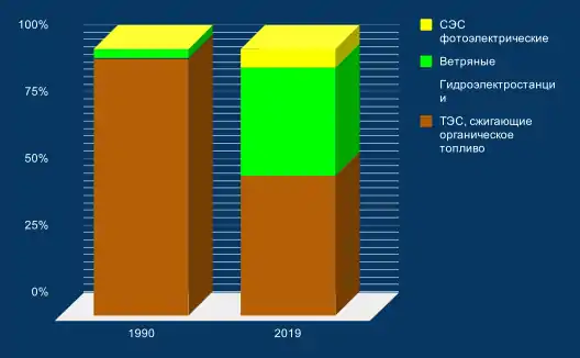 Как и в других странах Европейского союза, в Дании происходят существенные структурные изменения топливного баланса ТЭС в сторону увеличения сжигания природного газа, биотоплива и значительно вовлечения в баланс отходов. Что же касается структуры производства электроэнергии в целом то, если в 1990 г. выработка электроэнергии на ВЭС составляла 610 млн. кВт∙ч, в 2019 г. - 16150 млн. кВт∙ч, то есть рост более 26 раз. Широкое внедрение ВИЭ привело к снижению интегрального показателя эффективности в электроэнергетике - числу часов использования установленной мощности электростанций, что, в свою очередь, является одной из причин резкого увеличения средних цен на электроэнергию, в частности, для бытовых потребителей.