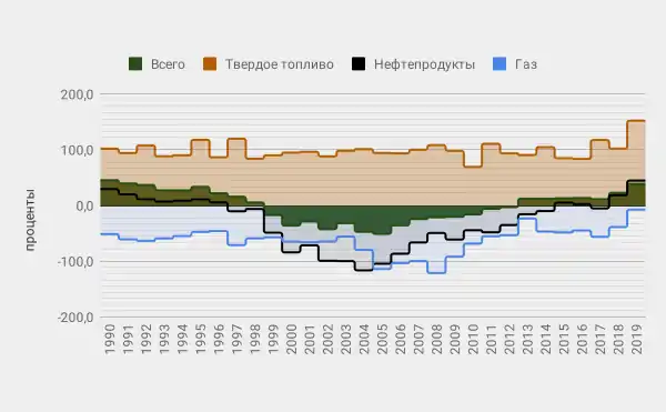 *Примечания. 1. Энергетическая зависимость показывает, в какой степени экономика зависит от импорта для удовлетворения своих энергетических потребностей. Рассчитывается из отношения импорта-нетто (импорт минус экспорт) на сумму валового внутреннего потребления первичных энергоносителей и бункерного топлива. 2. Отрицательное значение указывает на чистого экспортера: страну, которая экспортирует больше топлива, чем потребляет.