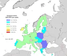 Экономика Европейского Союза (ЕС) состоит из внутреннего рынка экономик стран — членов союза, основанного на свободном рынке и продвинутых социальных моделях. ВВП на душу населения (ППС) составил 37 800 $ в 2015 году[3] по сравнению с 57 084 $ в Соединенных Штатах и 14 340 $ в Китае[16].