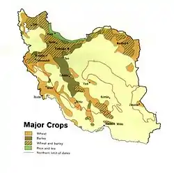Среди важнейших сельскохозяйственных культур пшеница, ячмень, рис, бобовые, хлопчатник, сахарная свёкла, сахарный тростник, табак, чай, орехи, фисташки.