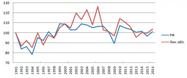 По итогам 2020 года Ленинградская область занимает 1 место по производству яиц и молочной продуктивности коров, 2 место - по поголовью птицы; 3 место - по выращиванию форели, 3 место - по производству мяса птицы в сельхозорганизациях, 9 место - по производству молока в сельхозорганизациях. В регионе также наблюдается хорошая урожайность салата, грибов, картофеля, ягод и прочего. Вырос и объем товаров пищевой промышленности – 167,7 млрд руб (123,7%). [5]