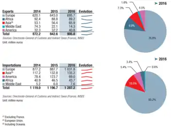| Партнёры по экспорту | Европа - 67,11 % Африка - 12,40 % Азия - 9,57 % Америка - 7,36 % Средний Восток - 3,55 % (2015) |