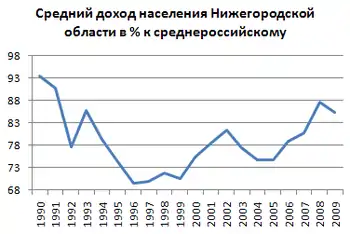 В 1991 году среднедушевые денежные доходы населения Нижегородской области составляли 423 руб/мес (91 % от среднероссийского уровня), в 1996 году — 534,6 руб/мес (69 % от среднероссийского уровня), в 2009 году — 14405,4 руб/мес (85 % от среднероссийского уровня).[19]