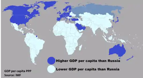 Экономика России занимает 6-е место среди стран мира и 2-е среди стран Европы по объёму ВВП по ППС, который за 2020 год оценивается в 4,097 трлн долларов[1]. По объёму номинального ВВП (1,7 трлн долларов США в 2020 году) Россия занимает 11-е место в мире и 5-е в Европе (по данным Всемирного Банка)[20]. Экономика России является смешанной и относится к переходному типу.
