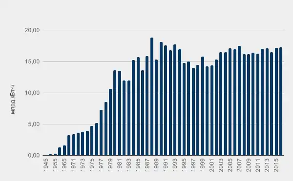 Электроэнергетика - важнейший сектор социально-экономического комплекса страны. Производство электроэнергии в республике за период с 1945 по 2016 гг. иллюстрируется следующей диаграммой
