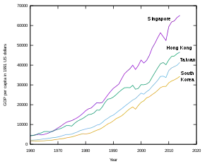ВВП на душу населения в четырёх азиатских тиграх (Сингапур, Гонконг, Тайвань и Южная Корея) с 1960 по 2014 год.