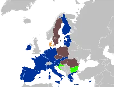 Все государства — участники Европейского союза (ЕС), за исключением Дании, пришли к соглашению о вступлении в «третью стадию». Для стран, желающих присоединиться к Европейскому союзу, существует ряд обязательных условий, Копенгагенских критериев, включающих в себя обязательные требования и срок для их выполнения. Важной составляющей является необходимость участия в течение двух лет в механизме валютных курсов (англ. ERM II), в котором кандидат должен обеспечивать фиксированный обменный курс к евро.