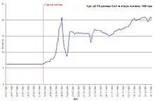 В пятницу 14 августа 1998 года Президент РФ Ельцин заявил: «Девальвации не будет. Это я заявляю твёрдо и чётко. И не просто это я придумываю или фантазирую или я не хотел бы, это всё просчитано. Это каждые сутки проводится работа и контроль…»[11][12]. Но уже через три дня, утром в понедельник 17 августа 1998 года Правительство России и Центральный банк объявили о техническом дефолте по основным видам государственных ценных бумаг[1] и о переходе к плавающему курсу рубля в рамках резко расширенного валютного коридора (его границы были расширены до 6 — 9,5 рубля за доллар США). Позже ЦБ фактически отказался от поддержки курса рубля. Если 15 августа 1998 года официальный курс за доллар США составлял 6,3 рубля, то 1 сентября 1998 года — 9,33 рубля, 1 октября — 15,9 рублей.[1]