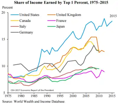 C 1980 по 2016 год имущественная доля 1 % самых богатых людей в Европе, США и Китае выросла с 28 до 33 %, тогда как доля, приходящаяся на нижние 75 %, колебалась около 10 % на протяжении всего периода.[18]