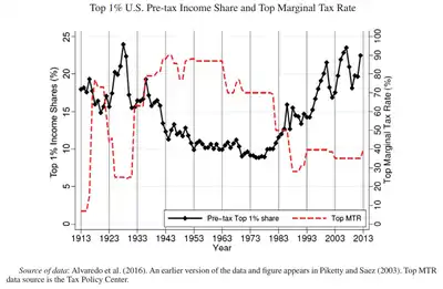 - Увеличение прогрессивности налога на доход.[22][42] Экономисты Эммануэль Саез и Тома Пикетти рекомендуют вернуться к высоким максимальным налоговым ставкам для богатых, к 50 %, или 70 %, или даже 90 %, как это было в первой половине XX века[43].