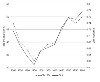 Например, чума в XIV веке привела к значительному сокращению населения. В результате нехватки рабочей силы доходы бедных слоев возросли во много раз. Это привело к значительному падению неравенства. С возобновлением роста населения неравенство начинало расти.