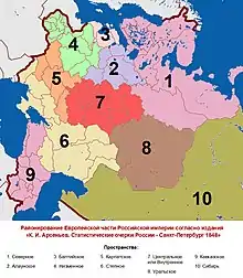 Первые опыты по экономическому районированию территории России относятся к работам Татищева (начало XVIII века). В качестве научного направления социально-экономической географии экономическое районирование в России существовало с XIX века. В 1818 году К. И. Арсеньев в работе «Начертание статистики Российского государства», (1818) указал «исходя из чисто географических соображений»[2], десять пространств — Северное (включало Финляндию), Алаунское, Балтийское (остзейские губернии), Низменное (в том числе Литва), Карпатское, Степное, Центральное, Уральское, Кавказское и Сибирское.