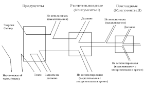 Распределение энергии и вещества в экосистеме может быть представлено в виде системы уравнений. Если продукцию продуцентов представить как P1, то продукция консументов первого порядка будет выглядеть следующим образом: