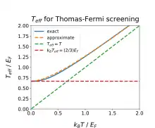 Экранирование в модели Томаса — Ферми - это теоретический подход к расчету влияния экранирования электрического поля носителями заряда в твердом теле.[1] Это особый случай более общего подхода в теории Линдхарда; в частности, экранирование Томаса-Ферми возникает как предельный случай формулы Линдхарда, когда волновой вектор (величина, обратная характерному размеру) намного меньше, чем фермиевский волновой вектор, то есть в длинноволновом пределе.