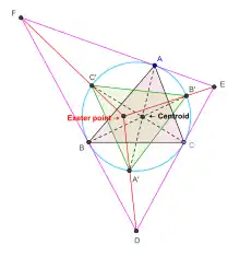 Определяется для треугольника следующим образом[1][2]: на описанной окружности отмечаются точки пересечения с медианами треугольника (, и для медиан, проведённых через соответствующие вершины), строится треугольник, образованный касательными к описанной окружности в вершинах заданного треугольника (, где — вершина, противоположная стороне, образованной касательной в вершине , — противоположная стороне, образованной касательной в ), в результате прямые, проходящие через , и оказываюся пересекающимися, и образуют эксетерскую точку. Иными словами, эксетерская точка — точка пересечения 3 прямых, проходящих через 3 пары точек: через вершину тангенциального треугольника и через соответствующую ей точку пересечения медианы с описанной окружностью исходного треугольника.