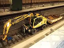 - на комбинированном шасси (например, пневмоколёсный с опускаемыми железнодорожными колёсными парами).