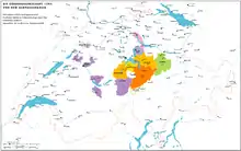 - В 1367 году в районе Кура и Энгадина возникла Лига дома Божьего, когда в 1367 году курский епископ Жан де Вьенн планировал передать управление своей епархией Габсбургам.[13] Лина уплатила долг епископа, и в последующие десятилетия усилила свой контроль над светской администрацией епископального княжества, пока в 1452 году не свергла регента епископа.