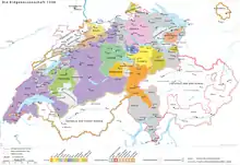 Как прямое следствие Швабской войны в 1501 году ранее ассоциированные города-государства Базель и Шаффхаузен присоединились к конфедерации.[3] В 1513 году их примеру последовал кантон Аппенцелль, ставший тринадцатым членом союза.[3] Города Санкт-Галлен, Биль, Мюлуз и Ротвайль, а также Три лиги в Граубюндене были партнерами конфедерации (Zugewandte Orte); Вале станет ассоциированным членом в 1529 году.