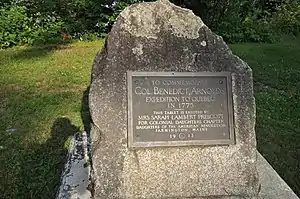Исторический памятник в Данверсе отмечает экспедицию Арнольда, помещенную Массачусетским обществом, сынами Американской Революции.[82] Существует также исторический памятник в Москве, поставленный в 1916 году Кеннебекским отделением Дочерей американской революции, и два на острове Скоухеган в штате Мэн, размещенном в 1912 и 2000 годах от Eunice Farnsworth Дочерей американской революции.[83] В Остисе, на западном берегу озера Флагстафф, стоит памятник, посвященный экспедиции. Озеро было создано в 20-ом веке, запрудив Мертвую реку с помощью плотины, затопив при этом часть маршрута экспедиции. Гора Бигелоу, на которую впервые взошел Тимоти Бигелоу, находится к югу от озера.