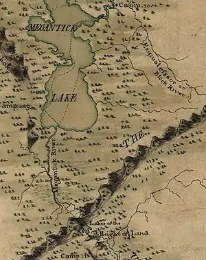 ![]() Детали из топографической карты 1924 той же области, аннотированной приблизительным маршрутом Арнольда. Озеро Пауков и болота, показанные к востоку от озера Мегатик, где части экспедиции были потеряны в течение нескольких дней. |