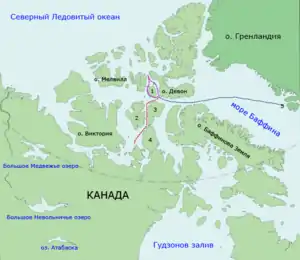 | Предполагаемый путь погибшей экспедиции. Путь из залива Диско (5) к острову Бичи, 1845 Путь вокруг острова Корнуоллис (1), 1845 Путь от острова Бичи через пролив Роберта Пила между островом принца Уэльского (2), островом Сомерсет (3) и полуостровом Бутия (4) к острову Кинг-Уильям, 1846 | |